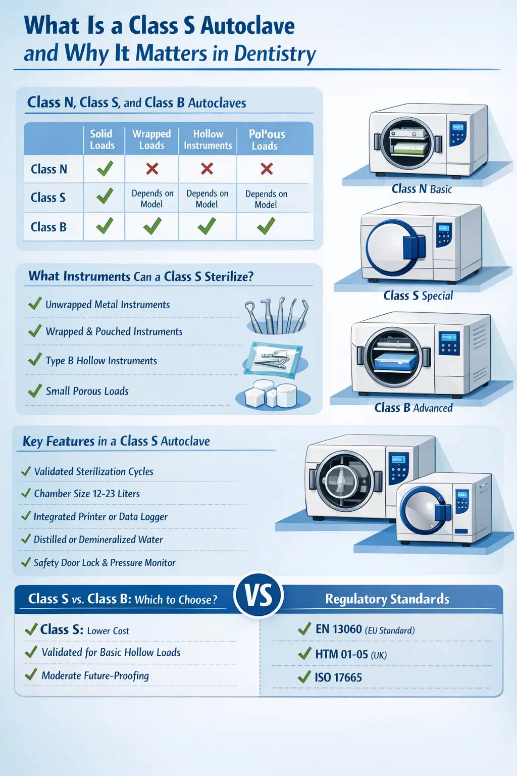 Class S (โดยที่ "S" ย่อมาจาก Special) ครอบครองจุดกึ่งกลางที่กำหนดไว้แต่มีความยืดหยุ่น ผู้ผลิตจะระบุอย่างชัดเจนว่าเครื่องจักรประเภทใดที่ได้รับการตรวจสอบ เครื่องนึ่งฆ่าเชื้อทางทันตกรรมคลาส S อาจสามารถฆ่าเชื้อเครื่องมือที่บรรจุถุงและวัสดุกลวงบางประเภทได้ แต่เฉพาะในกรณีที่ผู้ผลิตได้ทดสอบและบันทึกรอบการทำงานเหล่านั้นแล้วเท่านั้น ซึ่งหมายความว่าหม้อนึ่งความดัน Class S สองยี่ห้อจากแบรนด์ต่างๆ สามารถมีความสามารถที่แตกต่างกันอย่างมาก