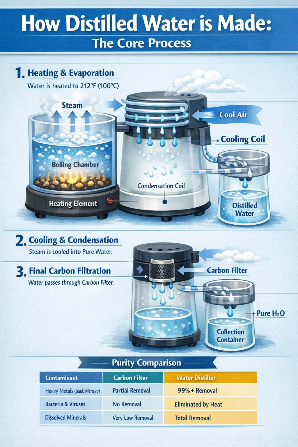 กระบวนการเริ่มต้นเมื่อห้องเดือดของ เครื่องกลั่นน้ำ เต็มไปด้วยน้ำประปา องค์ประกอบความร้อนไฟฟ้าที่ฐานจะเพิ่มอุณหภูมิถึง 212°F (100°C) . เมื่อน้ำถึงจุดเดือด น้ำจะเปลี่ยนเป็นไอน้ำ ก๊าซระเหยอาจถูกปล่อยผ่านช่องระบายอากาศ ในขณะที่สารปนเปื้อนที่ไม่ระเหย เช่น ตะกั่ว สารหนู และฟลูออไรด์ ยังคงติดอยู่ในถังต้ม
