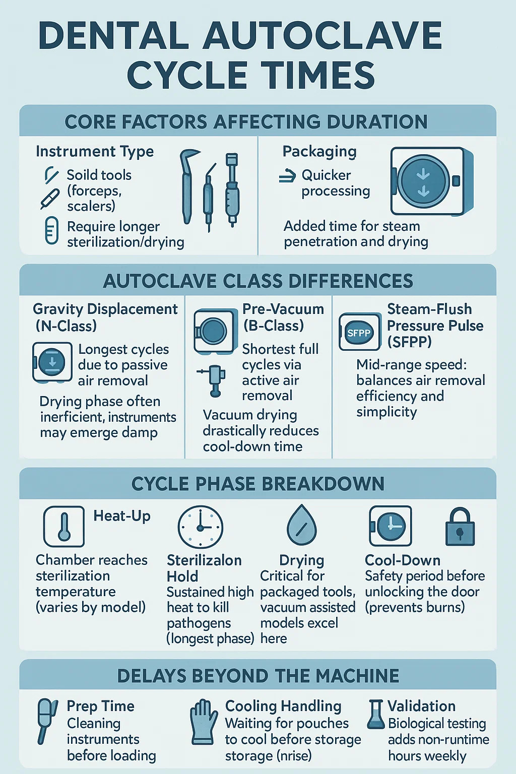 นี่คือรายละเอียดของ เครื่องนึ่งฆ่าเชื้อทางทันตกรรม รอบเวลาโดยเน้นที่ปัจจัยเชิงปฏิบัติ: