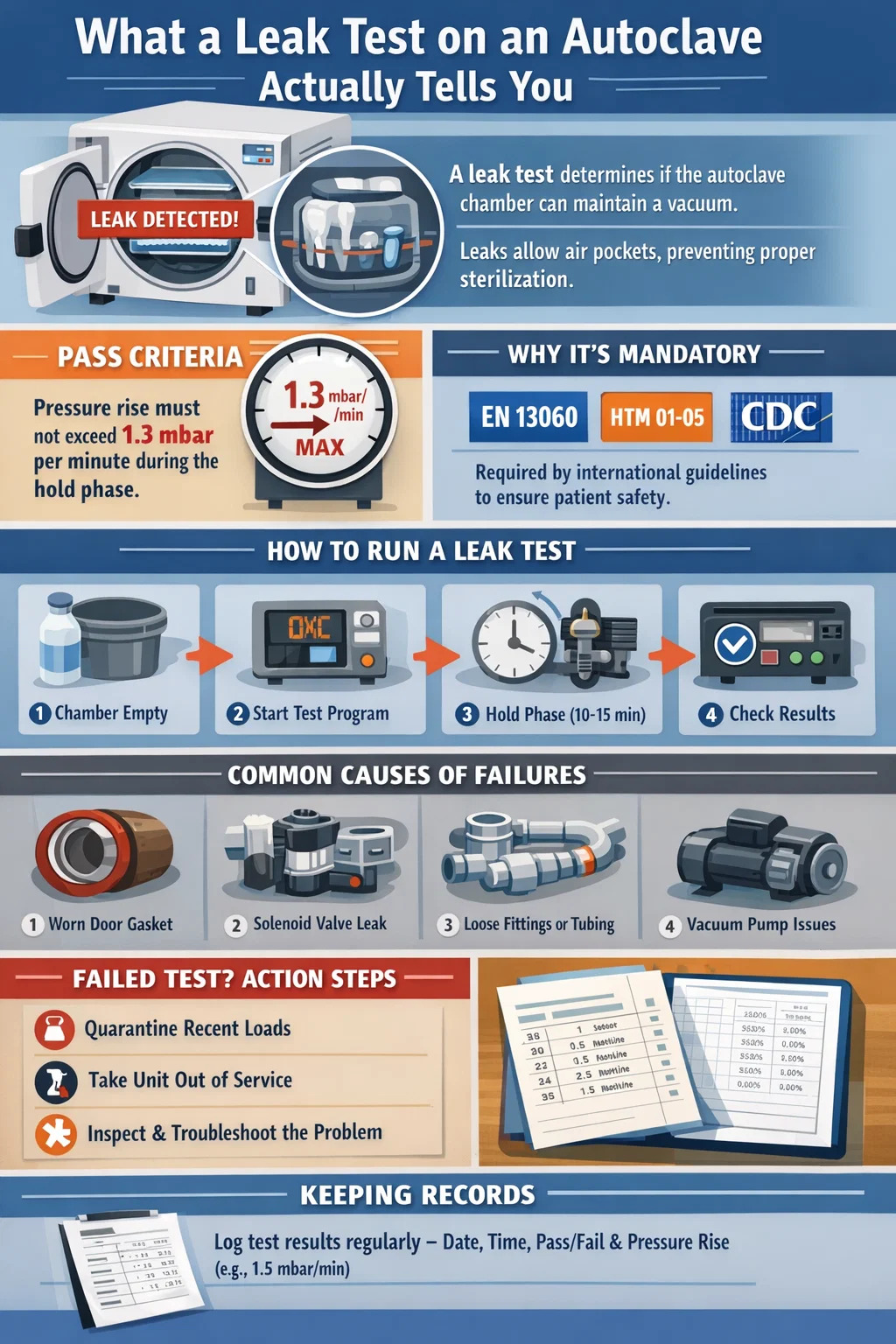 การทดสอบการรั่วบนหม้อนึ่งความดัน หรือที่เรียกว่าการทดสอบการรั่วของสุญญากาศหรือการทดสอบการรั่วของอากาศ จะวัดว่าห้องกักเก็บสุญญากาศได้ดีเพียงใดก่อนที่จะเริ่มรอบการฆ่าเชื้อ หากห้องเพาะเลี้ยงไม่สามารถรักษาแรงดันลบภายในเกณฑ์ที่ยอมรับได้ แสดงว่าอากาศเข้าสู่ระบบ ช่องอากาศป้องกันไอน้ำไม่ให้เข้าถึงพื้นผิวเครื่องมืออย่างสม่ำเสมอ ซึ่งทำให้ประสิทธิภาพในการฆ่าเชื้อลดลงโดยตรง ในหม้อนึ่งความดันทางทันตกรรม นี่ไม่ใช่ปัญหาการสอบเทียบเล็กน้อย มันเป็นข้อกังวลด้านความปลอดภัยของผู้ป่วย