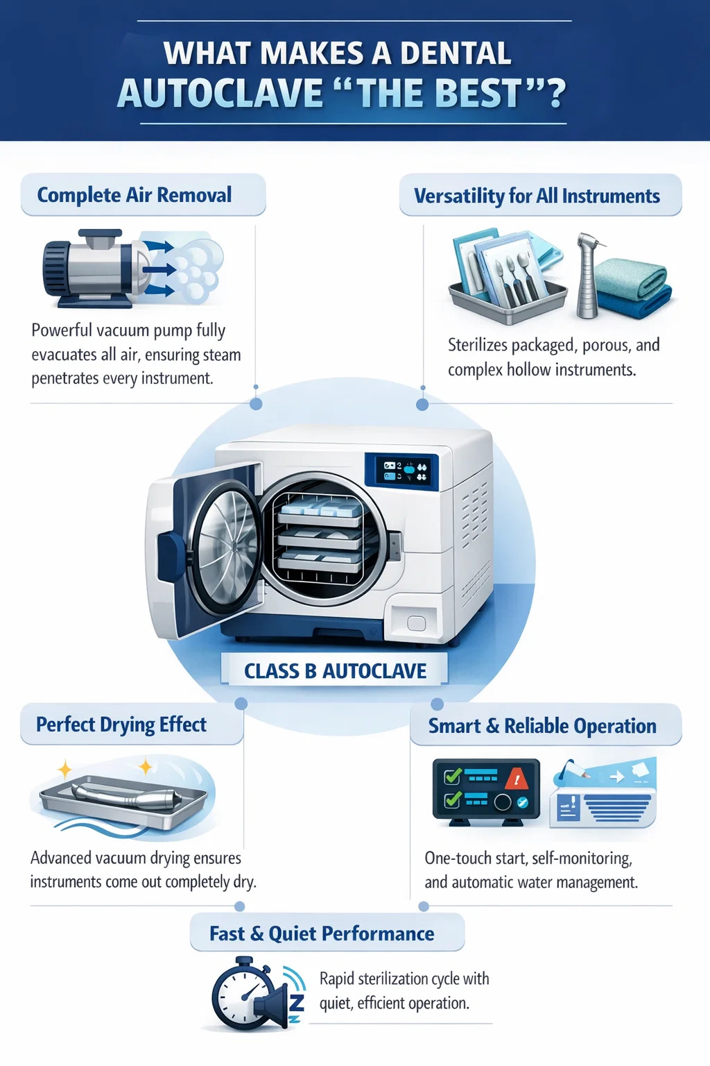 สำหรับคลินิกทันตกรรม ไม่มีแบบจำลองที่ "ดีที่สุดในโลก" เพียงแบบเดียว แต่ตัวเลือกที่ดีที่สุดที่เป็นที่ยอมรับโดยทั่วไปมักจะหมายถึง เครื่องนึ่งฆ่าเชื้อทางทันตกรรมคลาส B ที่สามารถรับมือกับสถานการณ์ที่ซับซ้อนต่างๆ และให้ประสิทธิภาพที่เสถียรที่สุด