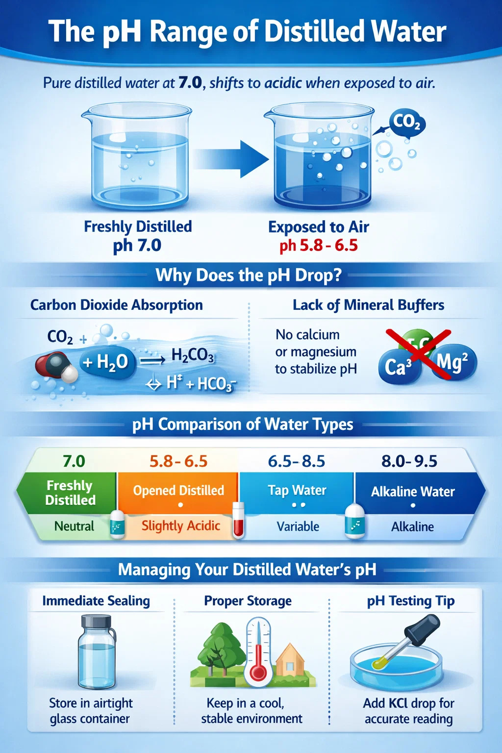 เพื่อให้เข้าใจว่าเหตุใดค่า pH จึงลดลง เราต้องพิจารณาปฏิสัมพันธ์ระหว่างน้ำบริสุทธิ์พิเศษกับสภาพแวดล้อมโดยรอบ การกลั่นเป็นกระบวนการที่ใช้ความร้อนสูงซึ่งจะดึงแร่ธาตุ "บัฟเฟอร์" ออกจากน้ำ